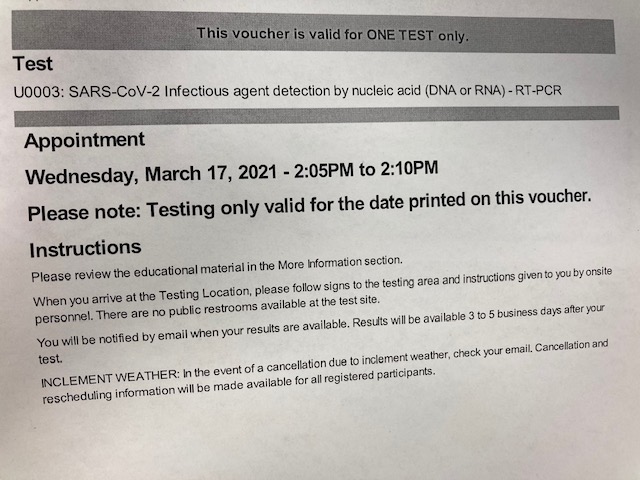 I nod and hand my COVID Testing Program paper voucher to the health care provider. He hands me a small, sealed baggie containing a plastic test tube and paperwork. I hold my baggie and wait for the next step.